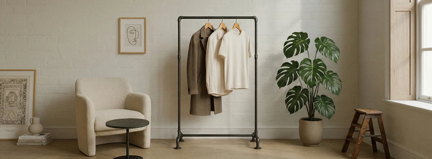 Garderobenstangen sind stabile Stangen, an denen du Kleidung aufhängst – vom Daily Outfit bis zur Capsule Wardrobe. Industrial-Modelle aus Metall/Wasserrohren sind markant, langlebig und platzsparend.